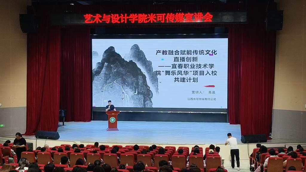 宣讲会上,易晨详细介绍米可传媒在传统文化与新媒体融合方面的实践经验,重点讲解“舞乐风华”项目入校共建计划。该项目旨在通过校企合作,将传统艺术与现代直播技术相结合,为学生提供实践平台,助力传统文化创新传播。