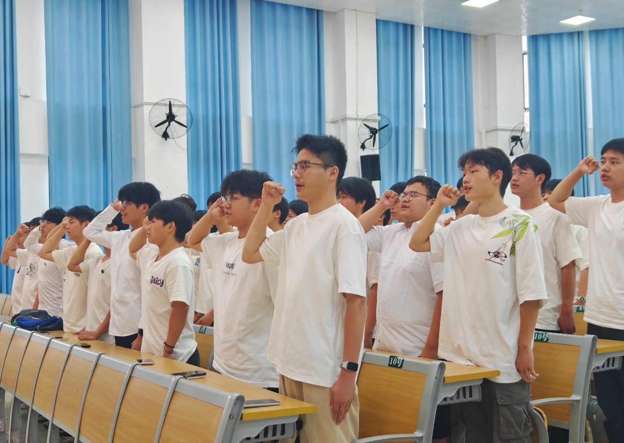 仪式在全体奏唱《中华人民共和国国歌》中正式拉开帷幕,罗建林宣读新团员名单。邓都为新团员代表颁发团徽与团员证,带领全体团员庄严宣誓,铮铮誓言响彻会场,彰显青春对信仰的坚定承诺。
