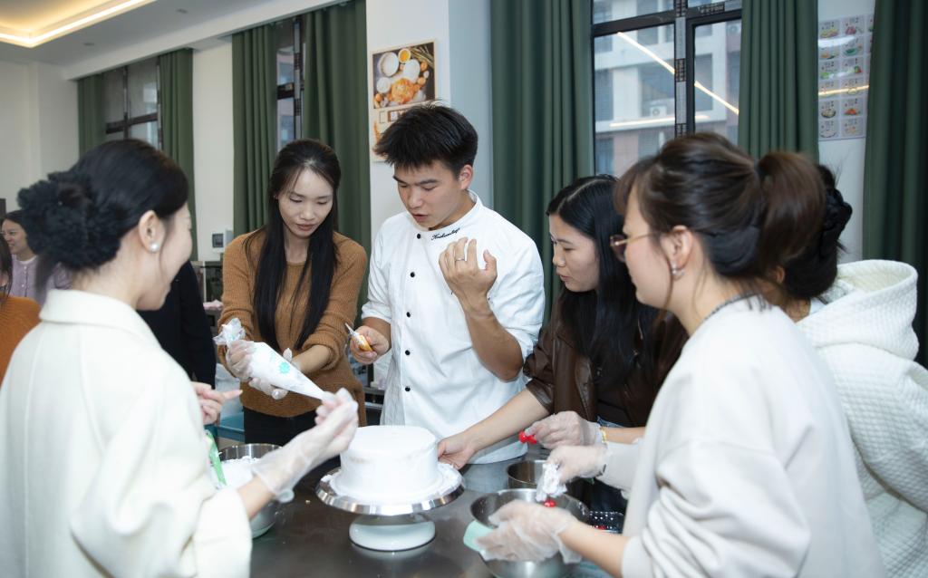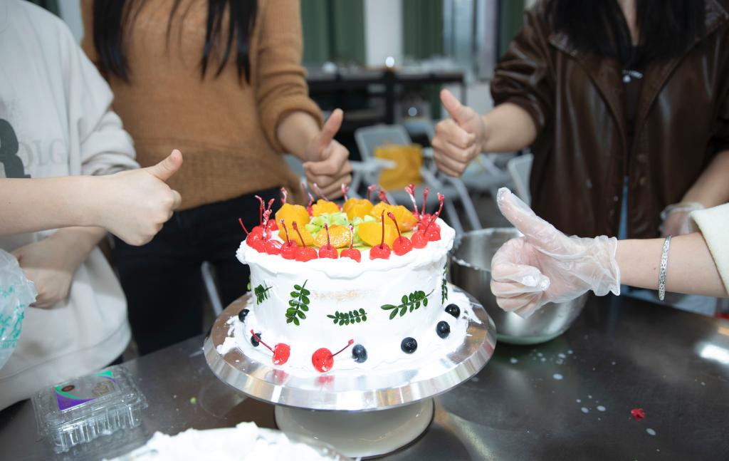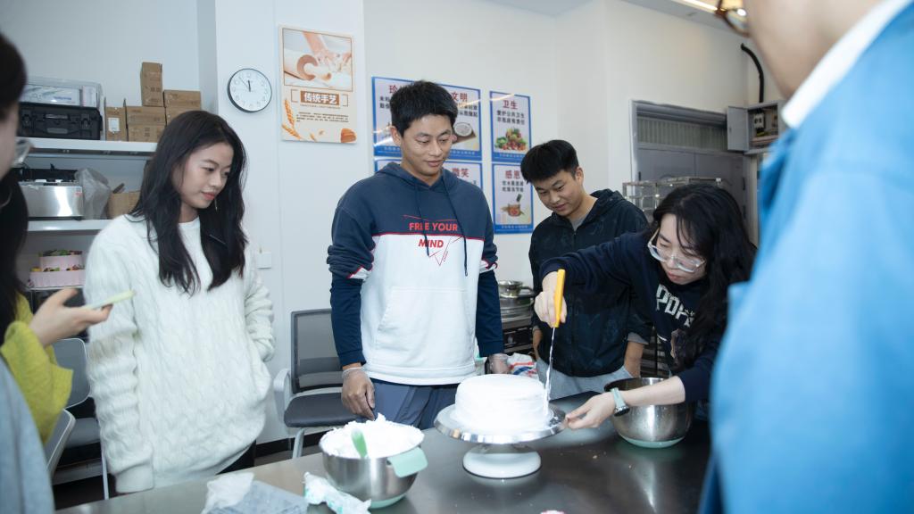 本次活动以团队协作与工作创新为核心,精心设计,实现了趣味性与实效性的深度融合。在团队素质拓展交流环节,专业面点师身着整洁的白色工装,详细讲解西式面点制作的核心技法,并配合动作逐步演示。辅导员们迅速被吸引,纷纷围拢在操作台前动手实践,从蛋糕制作的力度把控到裱花袋握姿的精准角度,每一步都用心体验,在揉、擀、裱的过程中感受手工技艺的魅力。现场氛围轻松热烈,大家在分享美食的过程中拉近距离,在欢声笑语中有效提升了团队凝聚力。