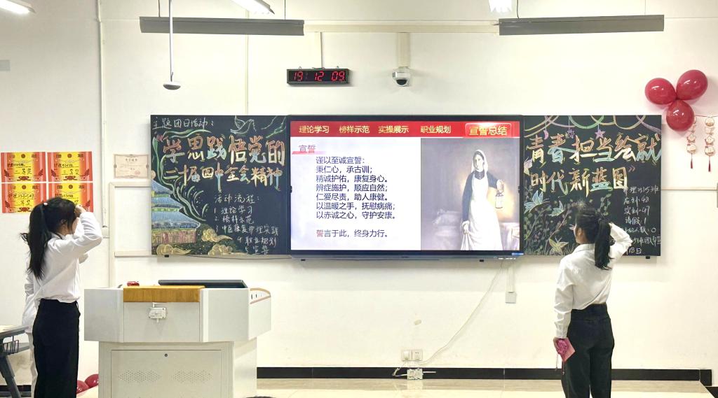 活动围绕党的二十届四中全会精神展开讲解,着重阐释其在“十五五”时期改革部署与现代化建设中的指导意义,帮助学生深刻领悟“两个确立”的决定性意义。经验分享环节,张婷同学结合基层服务经历,讲述了践行青年责任的心得。实践环节中,师生通过共同学习穴位按摩等技能、参与香包制作等活动,实现专业与实践融合。同学们书写并分享职业目标,在宣誓环节表达了坚定的理想信念。活动结束后,赖培鑫提出同学们应以“传承精华、守正创新”为指引,让中医护理在新时代绽放更耀眼的光彩。张彩凤在总结中着重强调:“我们青年一代要坚信党的领导,以护理担当做对社会、国家、党有用的人。”