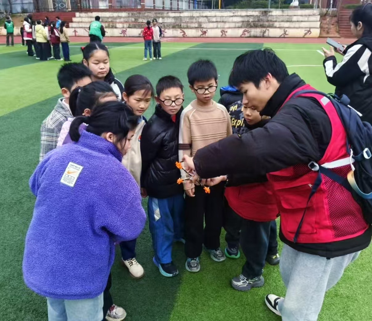 活动在多媒体教室拉开帷幕。“这是无人机的‘大脑’——飞控系统,负责接收指令、控制飞行姿态”,现场,志愿者们带着无人机实物,从机臂、电机、螺旋桨讲到电池、传感器,逐一展示部件作用;面对“为什么四个螺旋桨有两对是正反装?”的提问,画起受力分析图,将空气动力学原理用最直观的方式呈现给孩子们。随后,将课堂转移到操场,操控多架无人机腾空而起,完成盘旋、俯冲等动作,引来阵阵欢呼。