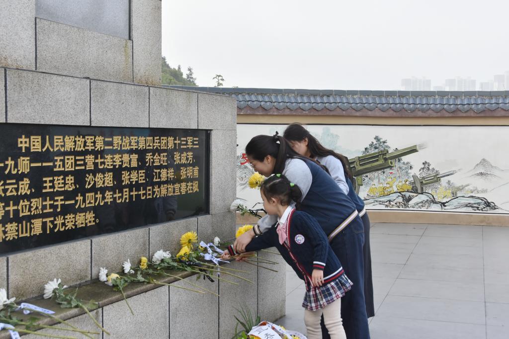 在瞻仰墓碑环节,全体人员有序绕行纪念碑一周。党员教师与团员教师轻声为身边的幼儿讲解碑文背后的故事,以“党团共建、大手拉小手”的方式,让红色历史变得可感可知。瞻仰结束后,大家依次将手中的菊花轻轻摆放在墓碑基座区域,每一朵鲜花都寄托着对英烈的无限追思。