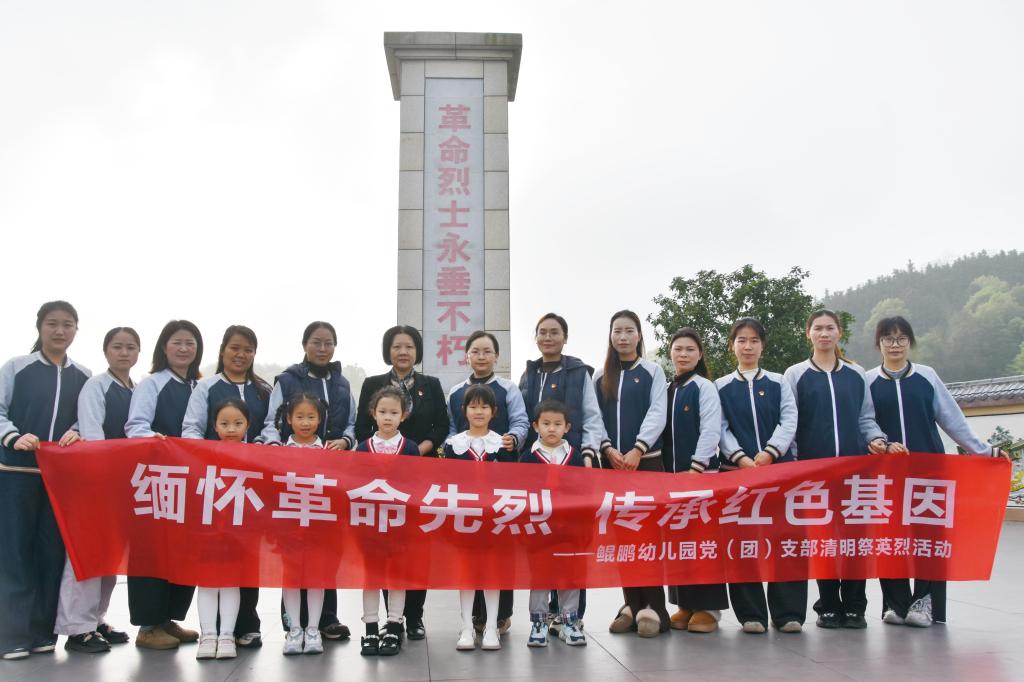 本站讯(鲲鹏幼儿园党支部 徐艳梅)青山埋忠骨,鲜花寄哀思。为深切缅怀革命先烈,传承红色基因,在幼儿心中播撒爱国爱党的红色种子,4月1日上午,鲲鹏幼儿园党支部组织全体党员教师、团员教师代表及幼儿代表共19人,前往江丰烈士陵园开展“缅怀英烈,童心向党”清明祭扫活动。