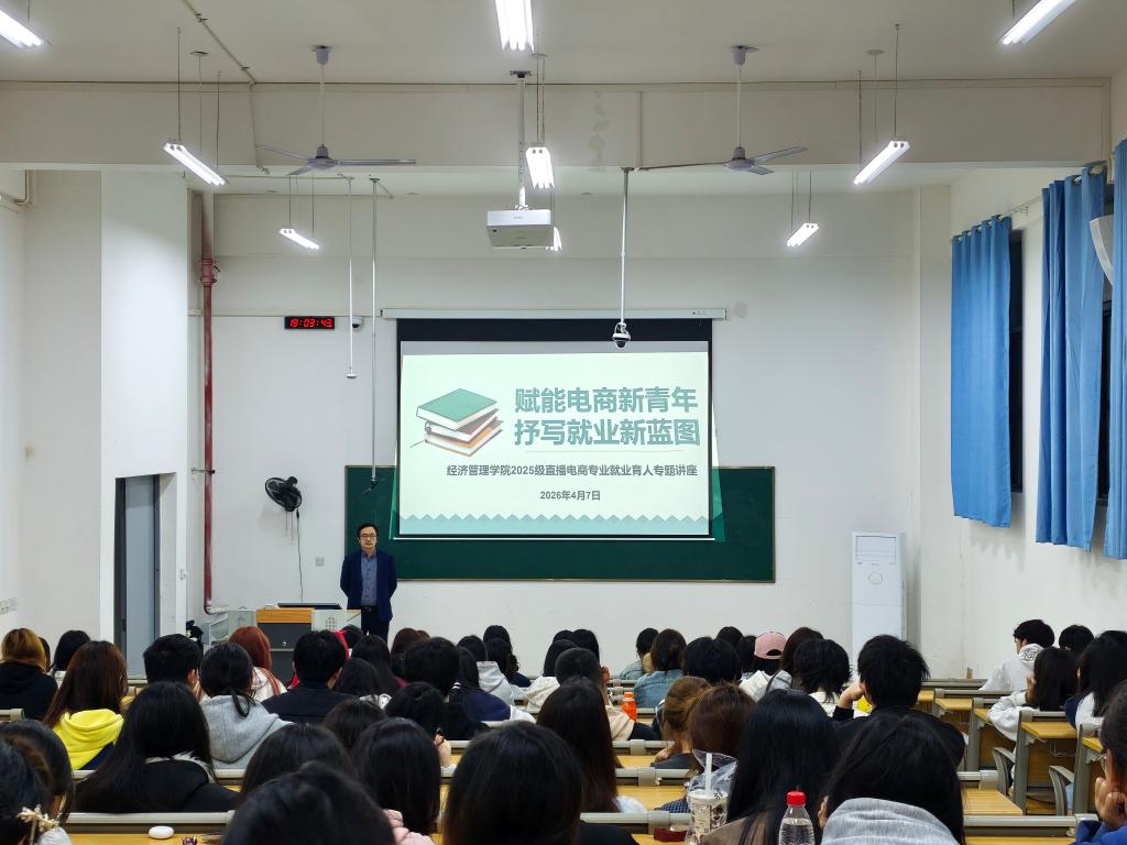 本站讯(经济管理学院 马思源)为深化校企合作对接,提升学生职业素养与就业竞争力,4月7日晚,经济管理学院在博达楼C区107举办2025级直播电商专业就业育人专题讲座。本次讲座由学院院长邓如星主讲,围绕直播电商行业趋势、岗位能力需求与职业生涯规划展开,近140名学生参与。