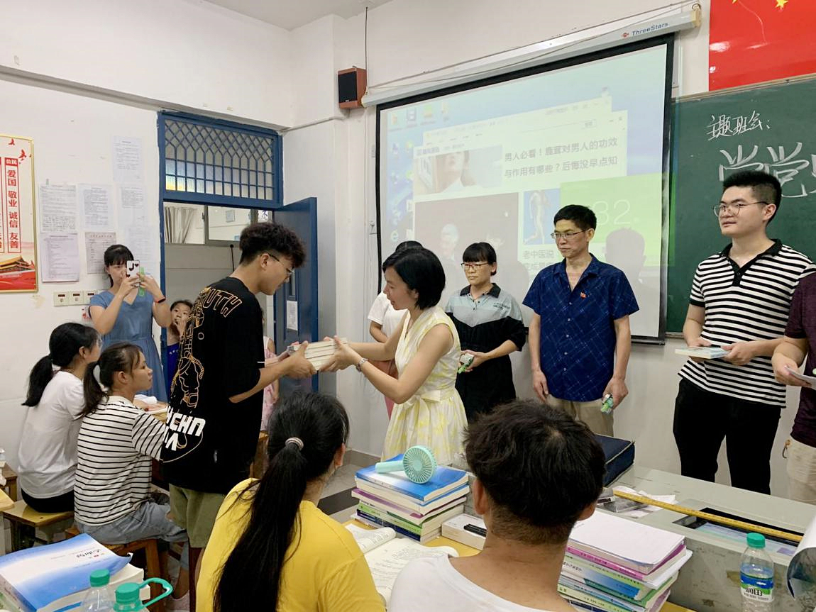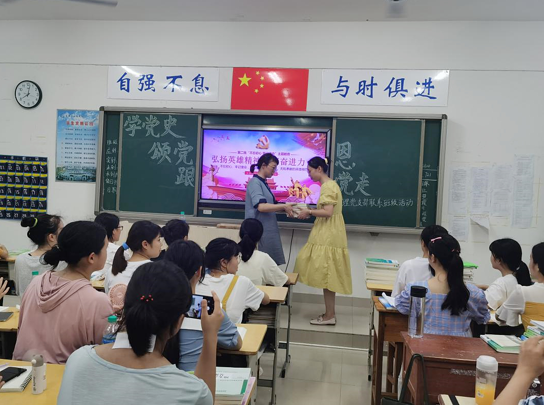 各支部党员老师围绕活动主题给同学们讲述了生动的党课,带领学生重温中国革命历史,讲述伟大的革命先烈精神,号召青年学生们努力奋斗、砥砺前行。课后,党员老师们给同学们赠送了经典读物,鼓励同学们学习中国历史和文化知识,弘扬革命精神,传播中华优秀传统文化。因近日天气日渐炎热,党员老师们还为同学们发放了防暑用品,嘱咐同学们注意防暑降温,爱护身体。