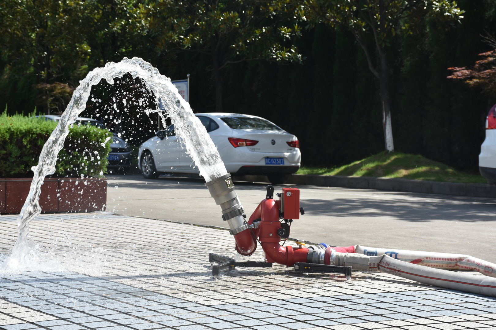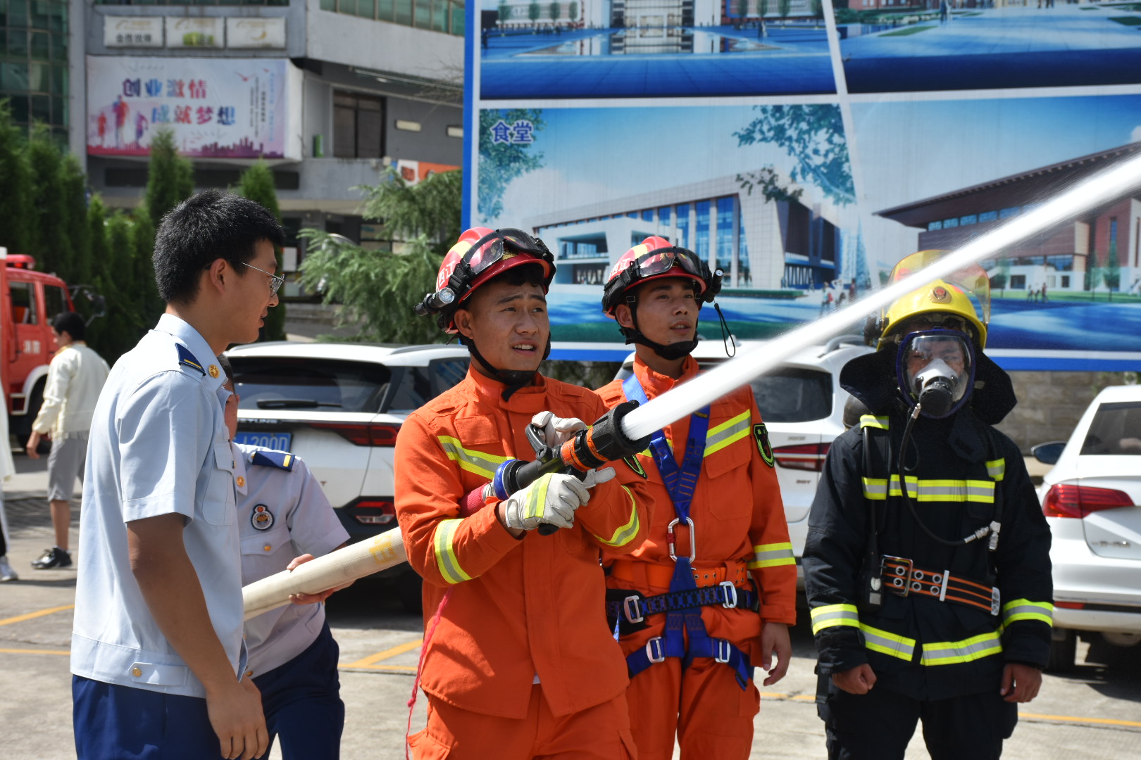 消防人员带领大家参观了消防车辆和各种消防器材,详细讲解了机动电锯、一级防化服、照明灯组、风力灭火器、移动消防炮等消防器材的功能用途,并现场演示使用方法。同学们仔细聆听,并亲身体验了如何穿戴消防装备和使用消防器材。