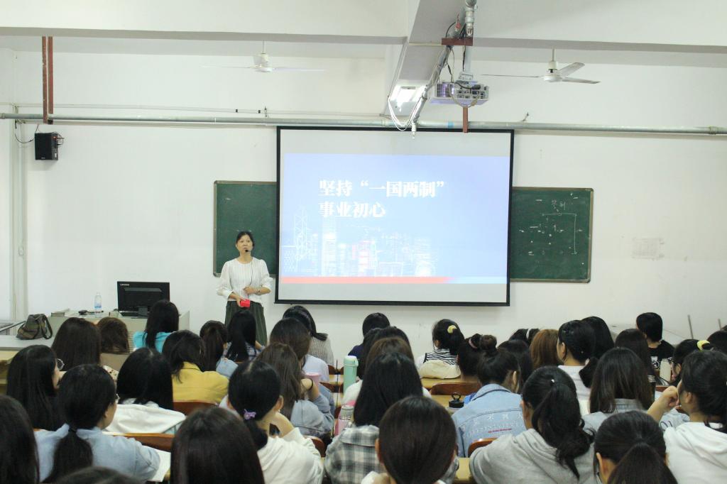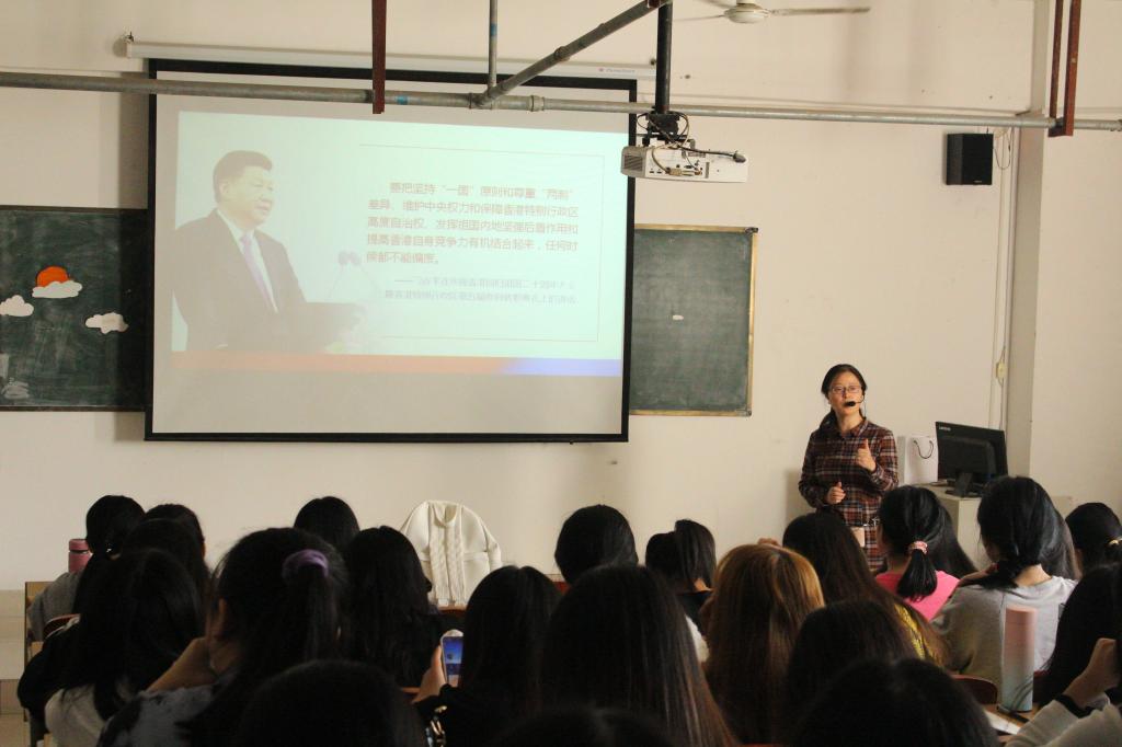 此次授课的主题为:坚持“一国两制”事业初心。首先,韩菁、刘海云与同学们探讨了“形势与政策”课的意义,提高了同学们对本课程的重视。随后,她们从四个方面引导同学们深刻而全面认识我国“一国两制”的基本内涵,实践成果,面临的阻扰和困难,以及我国坚定维护“一国两制”的决心和举措等。最后,进行师生互动,加深对学习内容的理解。