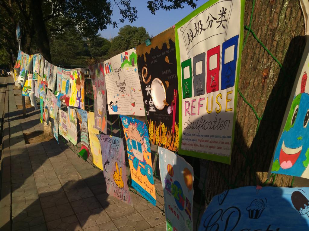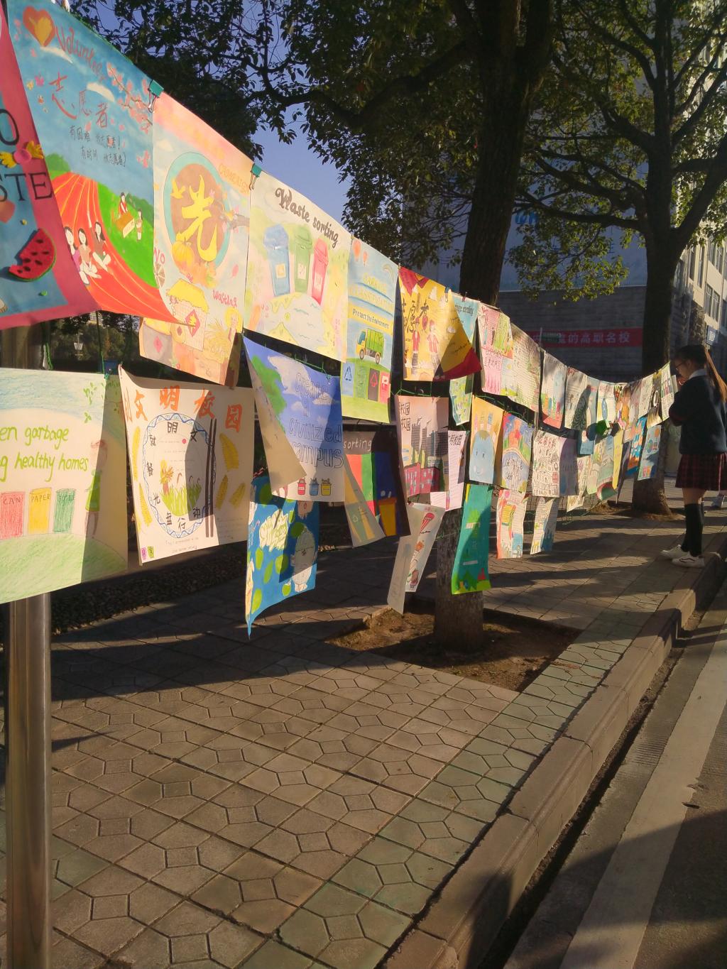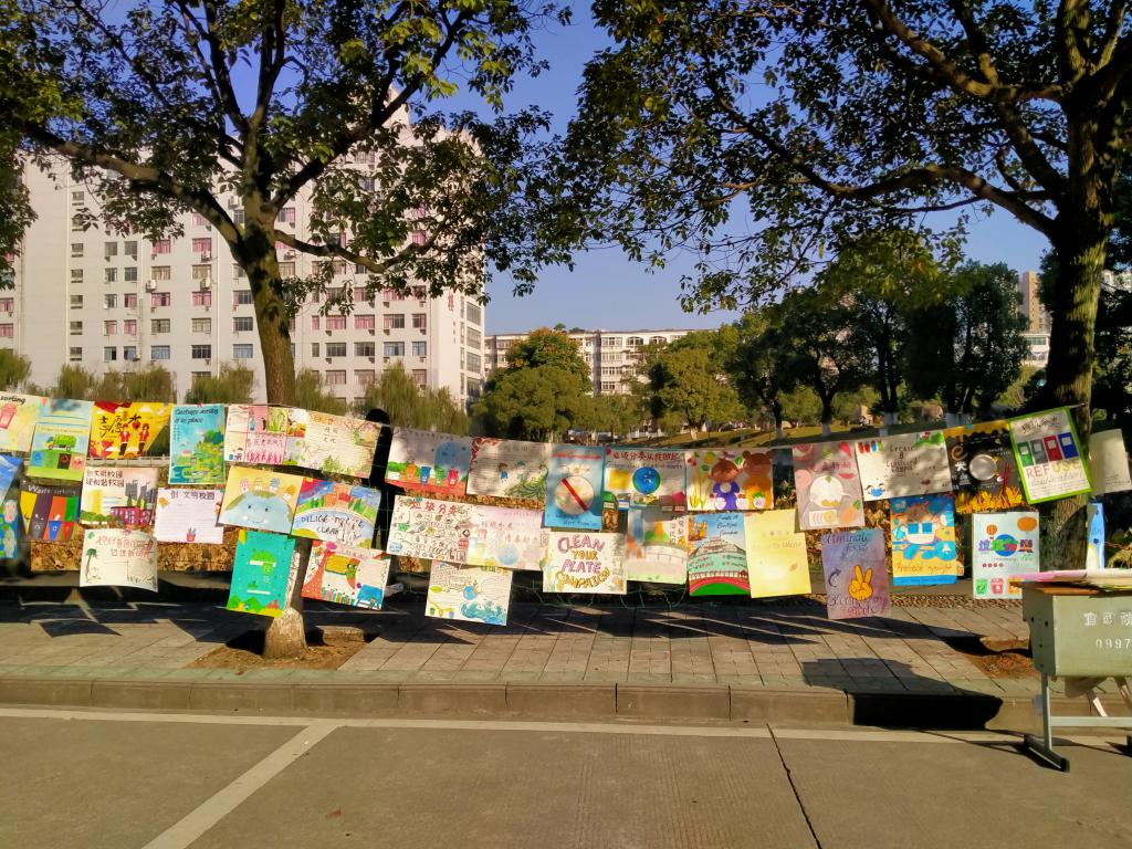 本次活动的优秀作品于运动会期间在学校荷花池路进行展出,展出的作品引来了路人的驻足观看,“创文明校园”的理念有效传播。