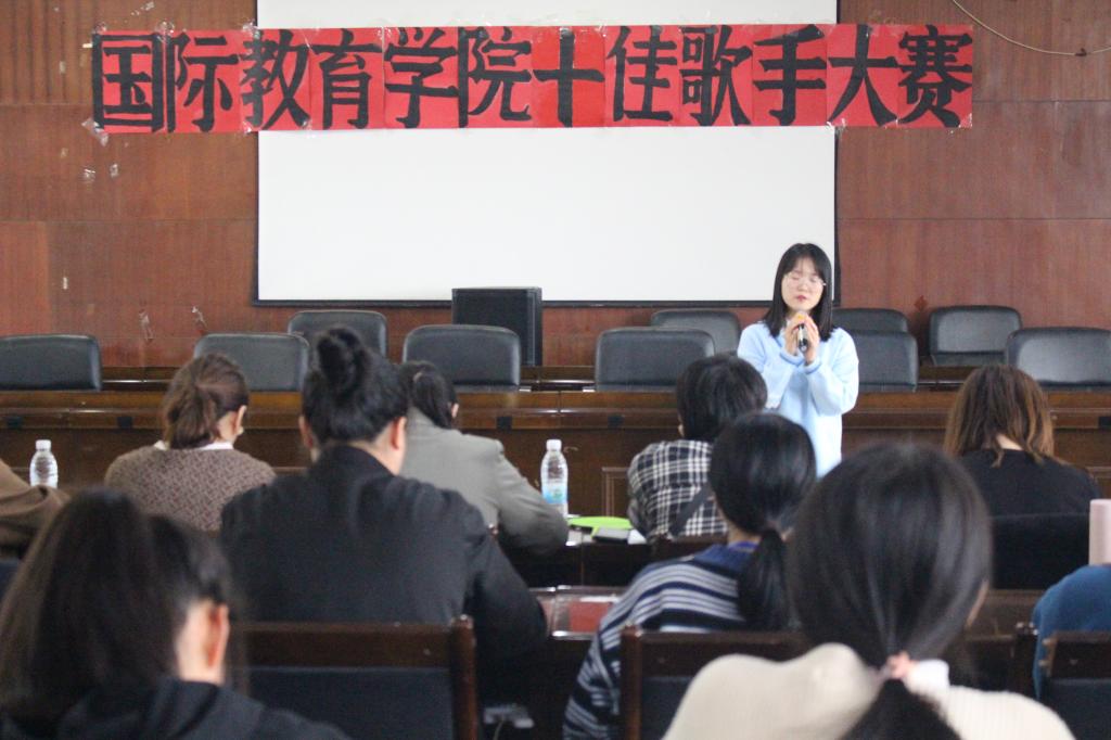 本站讯(国际教育学院 杨琨 学生记者 胡飞扬)为弘扬积极向上的校园文化,丰富我院学生的课余生活,国际教育学院于11月17下午14:30于第一教学楼九楼学术报告厅开展一年一度的“十佳歌手”大赛活动。担任本次大赛评委的有国际教育学院颜灵仪、纪仪芳、朱媛、金岩、张源晴以及特邀嘉宾易广成等六位老师。共有来自各班的36名选手参加比赛。校学生会综合部、财会与金融学院学生会主席团、机电与新能源学院学生会成员作为观众一同观赏。