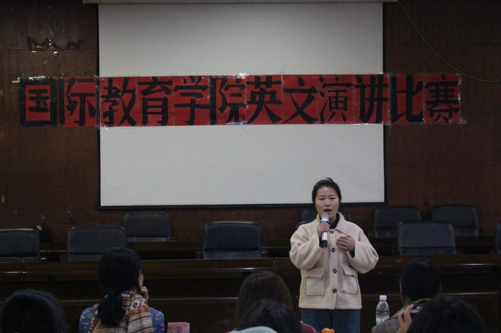 本站讯(国际教育学院 周宏 学生记者 舒芳铭)为提高学生英语演讲能力,强化学生师范生意识,国际教育学院学生会于11月24日下午14时在第一教学楼九楼学术报告厅开展以“A good teacher in my heart "为主题的“英语文化月”之英文演讲比赛活动。此活动为我院党建品牌“创新‘三全’体系,培养‘四有’人才”的主要活动之一。比赛邀请专业英语教研室罗小玲、姜雪美、周宏、严昳芳和邓述文五位老师做评委,共有46名选手参加、100余名学生观看,校学生会宣传部成员也应邀观看。