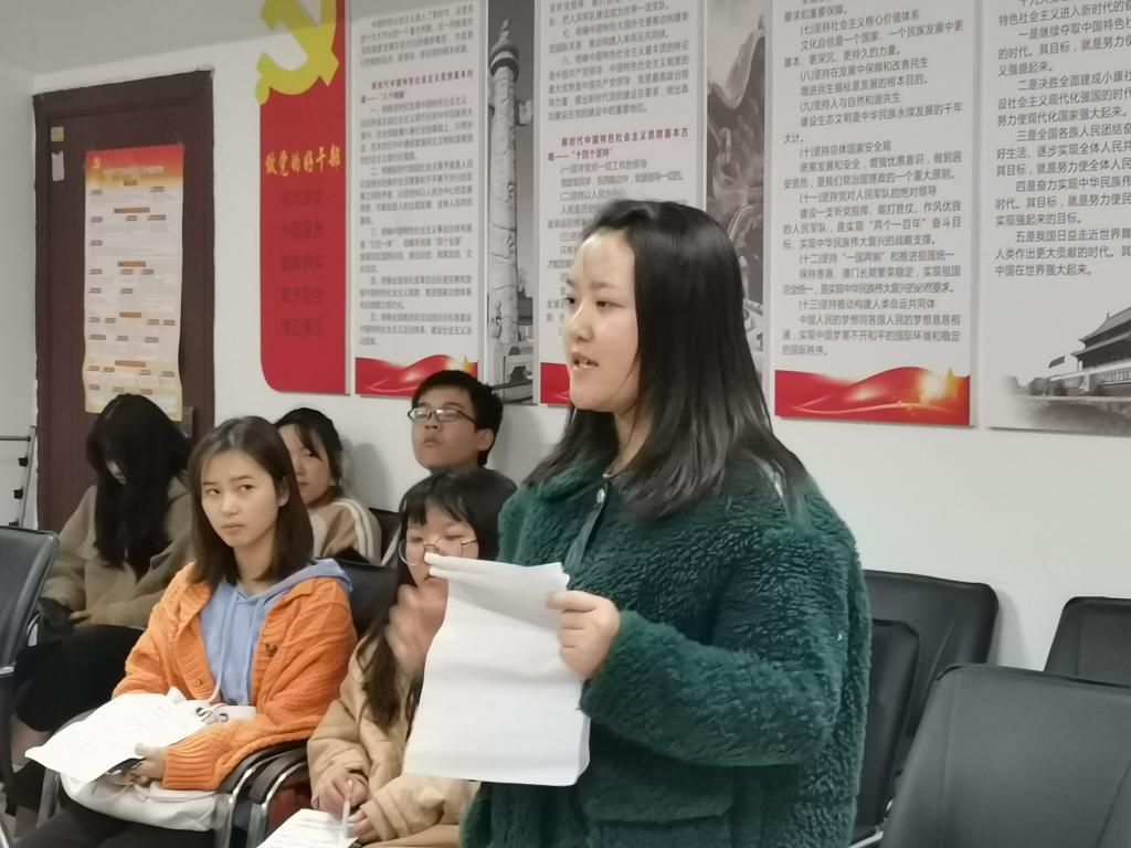 会议开始的前一周,团总支精选了《习近平谈治国理政》第三卷的部分章节,并下发至参会同学,要求同学们认真自学并结合自身实际撰写感想。讨论会上,气氛热烈,英语教育19301班的王贵丹同学说:“我们要不忘初心,牢记使命。在校期间认真学习专业知识,将个人成长的与祖国的发展结合起来,努力在每个岗位上发光发热。”英语教育16301班的李帆说:“重视学习、善于学习是中国共产党的优良传统和宝贵的历史经验,作为入党积极分子的我将孜孜不倦的学习,不断完善自我,做有理想有担当的新时期新青年。”会议最后,周沫利进行了总结,她鼓励同学们多阅读原著,通过阅读了解马克思主义中国化的最新成果,更多的了解中国共产党,并将勇于担当、乐于奉献的精神带到生活中去,鼓励和影响身边更多的人。