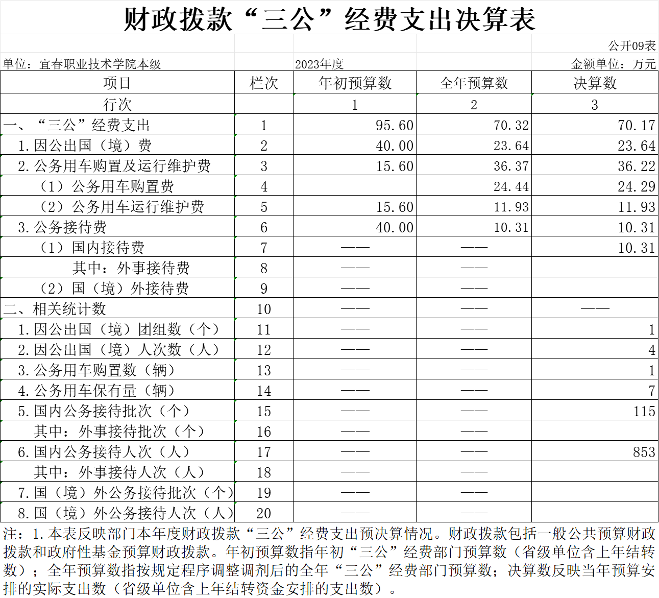 (一)“三公”经费:是指用财政拨款安排的因公出国(境)费、公务用车购置及运行维护费和公务接待费。其中,因公出国(境)费反映单位公务出国(境)的国际旅费、国外城市间交通费、住宿费、伙食费、培训费、公杂费等支出;公务用车购置及运行维护费反映单位公务用车车辆购置支出(含车辆购置税、牌照费),按规定保留的公务用车燃料费、维修费、过桥过路费、保险费、安全奖励费用等支出;公务接待费反映单位按规定开支的各类公务接待(含外宾接待)支出。