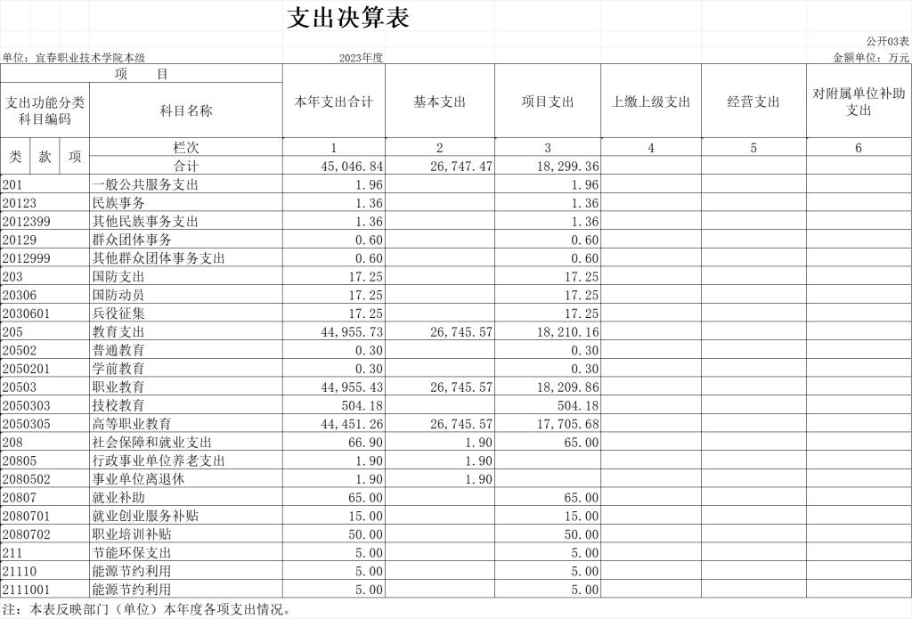 本单位2023年度支出总计45064.84万元,其中本年支出合计45064.84万元,比上年增加9989.75万元,增长28.48%,主要原因:为满足新校区教学需求进行了大量设备采购;结余分配 0万元,比上年增加(减少)0万元,增长(下降)0%;年末结转和结余311.10万元,比上年减少32.12万元,下降9.36%,主要原因:新校区搬迁工作结束,本单位支出恢复常态趋于平稳。
