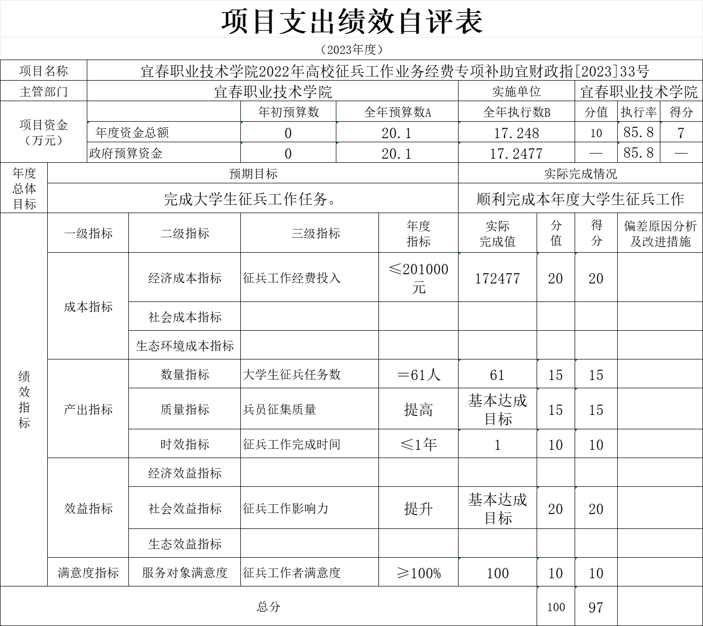 (二)国防支出年初预算数为0万元,决算数为17.25万元,完成年初预算的100%,预决算差异主要原因:追加专项拨款。