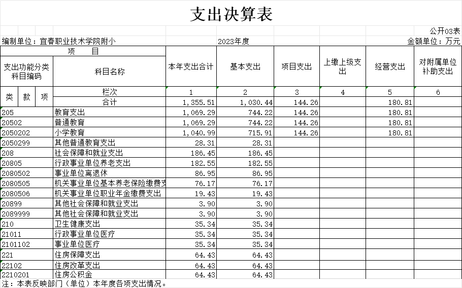 本单位2023年度支出总计1355.51万元,其中本年支出合计1355.51万元,比上年增加47.01万元,增长3.59%,主要原因:本年新增学校操场重建项目;结余分配0万元,比上年增加0万元,增长0%;年末结转和结余48.46万元,比上年增加2.89万元,增长6.34%,主要原因:部分资金在学期末支出。