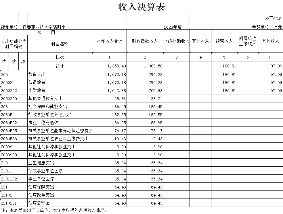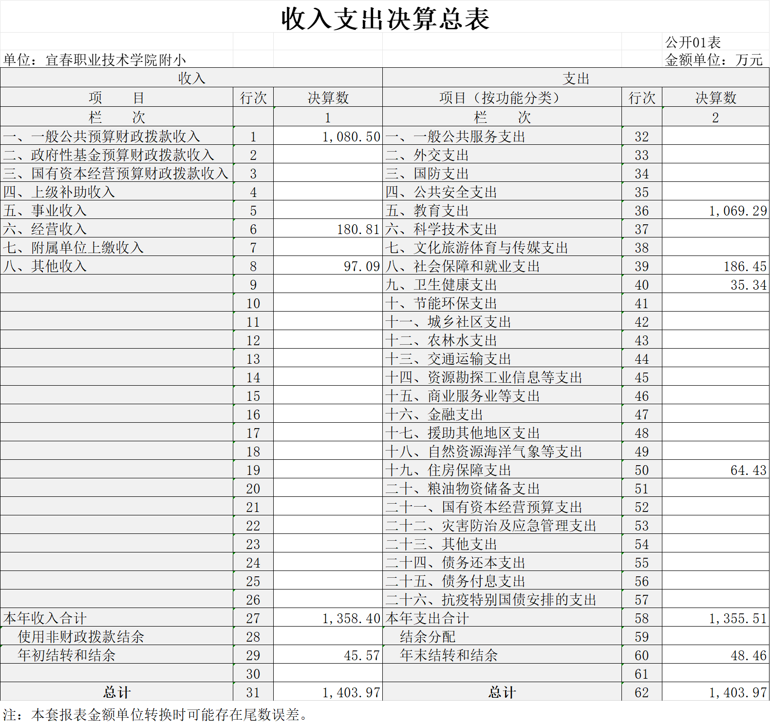 本单位2023年度收入总计1358.40万元,其中年初结转和结余45.57万元,比上年减少5.31万元,下降10.44%;使用非财政拨款结余和专用结余0万元,比上年增加(减少)0万元,增长(下降)0%;本年收入合计1403.97万元,比上年增加49.90万元,增长3.68%,主要原因:本年新增2名教师,新增了校园操场重建项目。