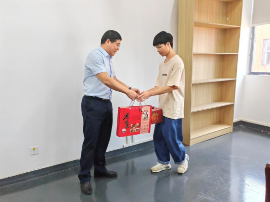 本站讯(机电与新能源汽车学院 何仪)情满中秋,喜迎国庆,关爱撒满校园。在中秋国庆双节来临之际,9月27日上午,校党委书记任军代表学校到机电与新能源汽车学院走访慰问困难学生,并向他们表达真切问候和美好祝福。学院党总支书记赵琰,院长吴东平,党总支副书记宋秋奴,学生辅导员和班主任参加此次活动。