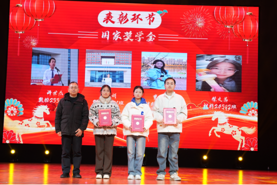 晚会在乐队演绎的经典曲目《光辉岁月》中拉开帷幕。随后,弹唱节目《你要跳舞吗》由学院教师、宁德时代订单班全体同学呈现,以欢快节奏带动氛围朗诵《校企同心、筑梦行》则诉说着学院与宁德时代宜春基地的合作佳话,字字句句饱含对产教融合的期许与赞颂,彰显党建引领示范作用情景剧《工匠之心》生动展现了职教学生精益求精的职业追求舞台剧《白雪公主和七个大高个》则以创新改编带来欢声笑语。晚会期间,到场嘉宾及领导为过去一年中获得职业技能大赛和国家奖学金的优秀同学颁奖,鼓励师生积累先进经验,继续