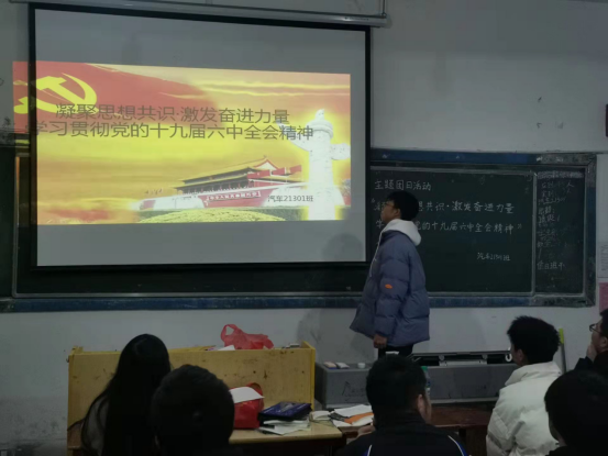 本站讯(机电与新能源汽车学院 周勤 学生记者 刘鑫)为深入学习贯彻党的十九届六中全会精神,引导我院青年学子积极跟进党的先进思想,大力弘扬伟大建党精神,坚守理想信念、牢记初心使命。我院于12月28日晚对各班级开展“凝聚思想共识·激发奋进力量——学习贯彻党的十九届六中全会精神”主题团日活动。