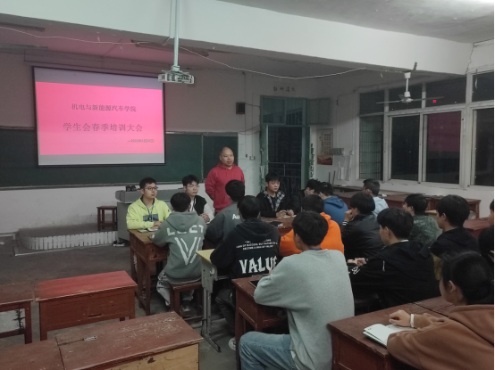 本站讯(机电与新能源汽车学院 周勤 学生记者 廖建星)3月20日晚,机电与新能源汽车学院在第二教学楼四楼会议室开展了本学期学生会春季培训大会,出席本次大会的有机电与新能源汽车学院团总支书记周勤老师、校学生会主席团成员杨舸玉及学生会全体工作人员。