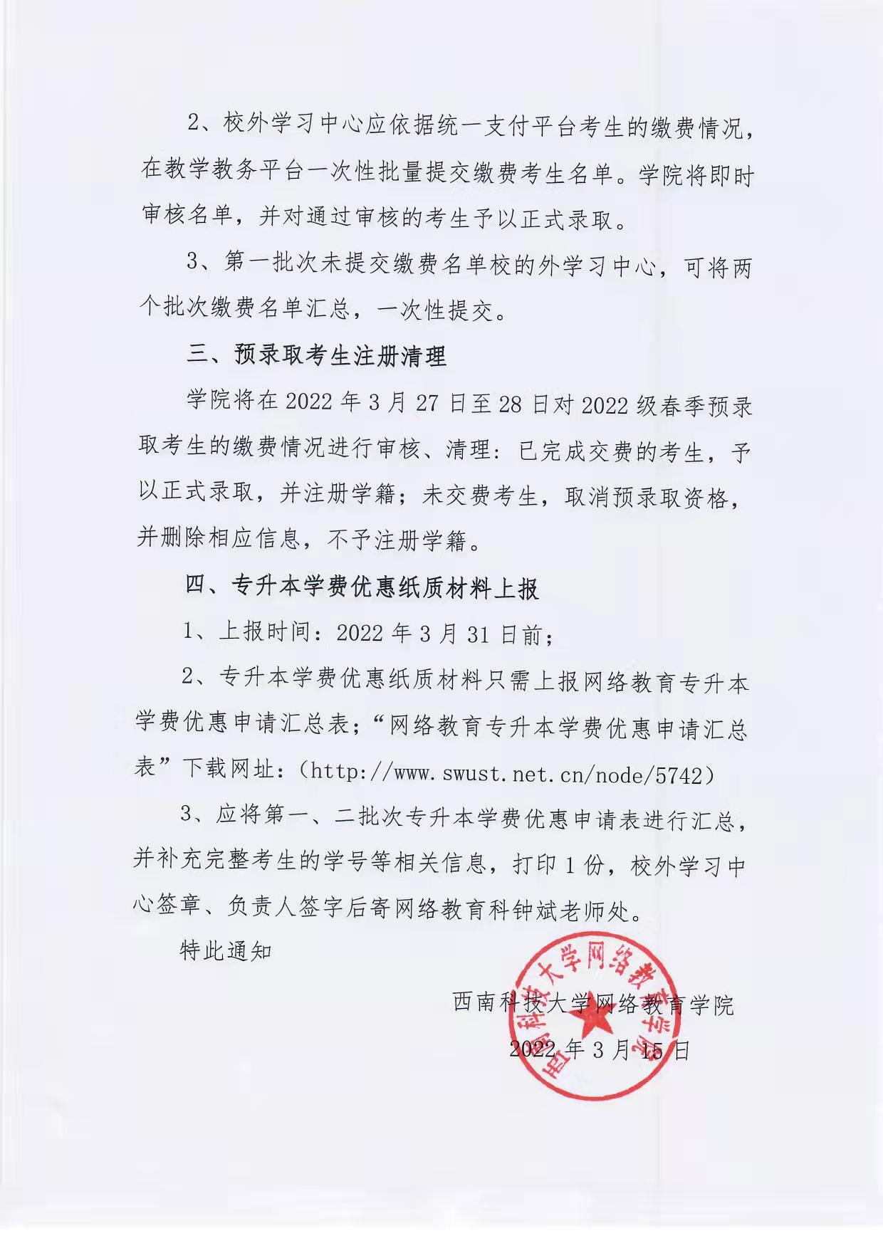 西南科技大学网络教育学院关于2022级春季预录取考生缴费的通知