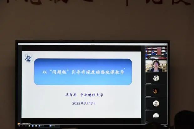 冯秀军教授以《以“问题链”引导有高度的思政课教学》为题,为线上线下的思政课教师作了一场有政治高度、理论深度、历史厚度、实践温度、改革力度、实际效度的专题辅导报告。冯教授带领大家重温习近平总书记在学校思想政治理论课教师座谈会上的重要讲话精神,指出思政课肩负“国之大者”的神圣使命,是引领青年、武装青年头脑的人生大课。冯教授就大家普遍关心的“如何上好思政课”“如何让课堂有深度有内涵有实效”“为何要进行问题链教学改革”等问题进行了详细阐述。