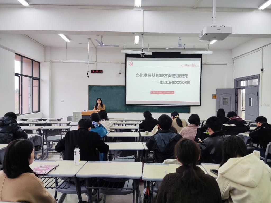 会上,孙美兰老师以《文化发展从哪些方面愈加繁荣——建设社会主义文化强国》为题进行教学展示。结合丰富的案例和数据,孙老师多角度展示了建国75周年来文化发展的成就。展示完毕后,教研室老师围绕教学环节设置、教学案例选取等展开讨论。曾骏指出要以问题链式的形式呈现授课内容,引导学生思考。万露露认为教学中可以选取重点案例讲深讲透。还有教师提议通过李子柒传播中华优秀传统文化的案例来增强学生的文化自信。