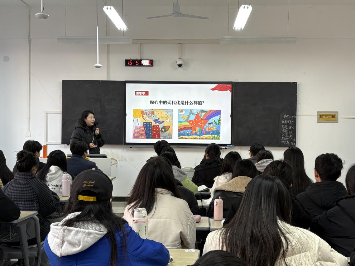 宋彩虹以“中国式现代化的中国特色”为题,从“大家心目中的现代化是什么样子”导入课堂,运用案例分析、东西方对比、师生互动探讨等方式,讲述中国式现代化的发展过程、基本特征以及中国特色等。课后,教研室全体教师进行评课。
