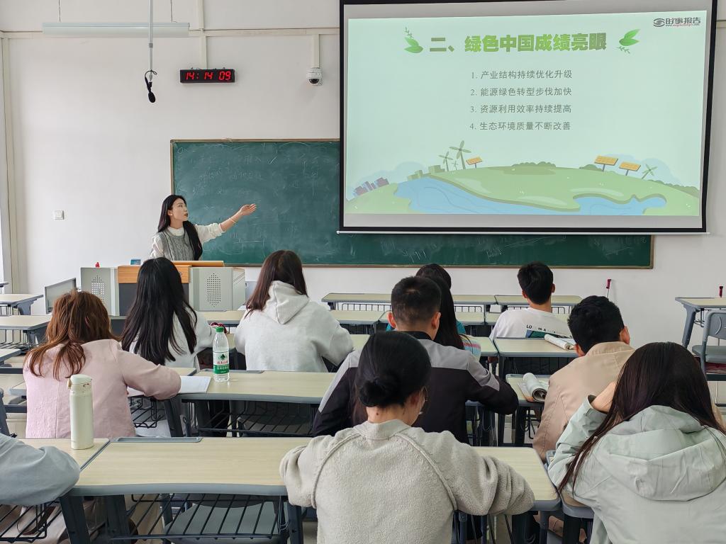会上,刘娟老师以《厚植绿色底色 建设美丽中国——绿色中国 成绩亮眼》为题进行教学展示。她结合学生对“City Walk”的兴趣,通过案例分析和课堂互动相结合的方式,讲述了绿色发展理念的文化根源、实践举措及成效,将抽象理论转化为具象案例,激发学生的学习兴趣。
