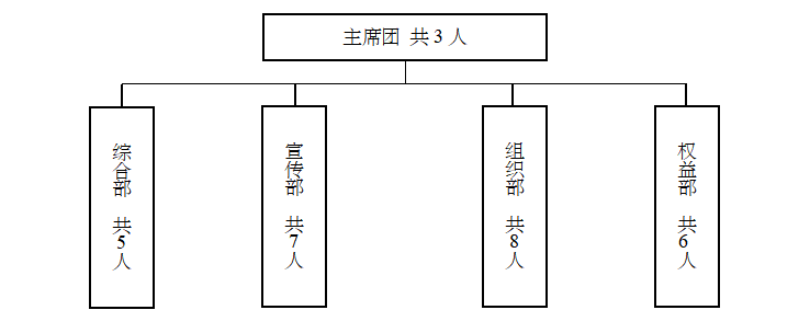 院学生会工作人员不超过30人,主席团成员不超过3人,工作部门精简至四个部门(综合部、宣传部、组织部、权益部)。除学生会主席团成员和工作部门成员,均不设置其他任何职务。学生会组织确需主办的重大工作或活动,可根据需要以项目化方式招募志愿者,吸收同学参加,因事用人,事完人散。