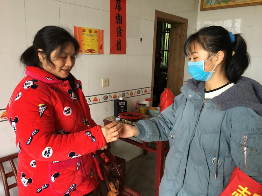 辛颖与村委的工作人员一起巡村,宣传疫情防控和禁止外来车辆、外来人员进村,并为村民测量体温,宣传防疫知识,呼吁大家不信谣,不传谣。
