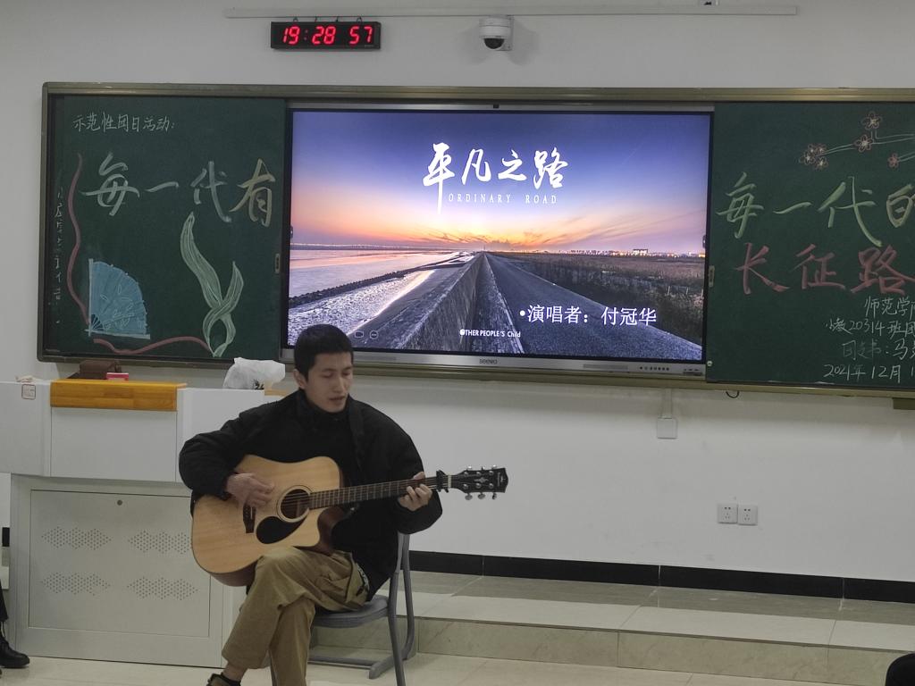 本次活动在两位同学声情并茂地朗读声中拉开了帷幕。首先映入眼帘的是《长征精神》与《歌唱青春》,新颖的形式与独特的歌声令同学们眼前一亮,称赞不已。其次,个人吉他演奏《平凡之路》,为每个在人生路上奋斗的逐梦青年带来了共同心声。最后,用竹笛演奏的曲目《青花瓷》余音绕梁,为此次活动增添了浓墨重彩的一笔。活动接近尾声,同学们齐唱歌曲《夜空中最亮的星》,出色的演出,默契的配合,触动着同学们的心弦,整个教室都弥漫着青春的朝气,让同学们不仅联想到,中国共产党就好像那夜空中最亮的星,指引着我们前进的方向,引领着我们走向光明的未来!