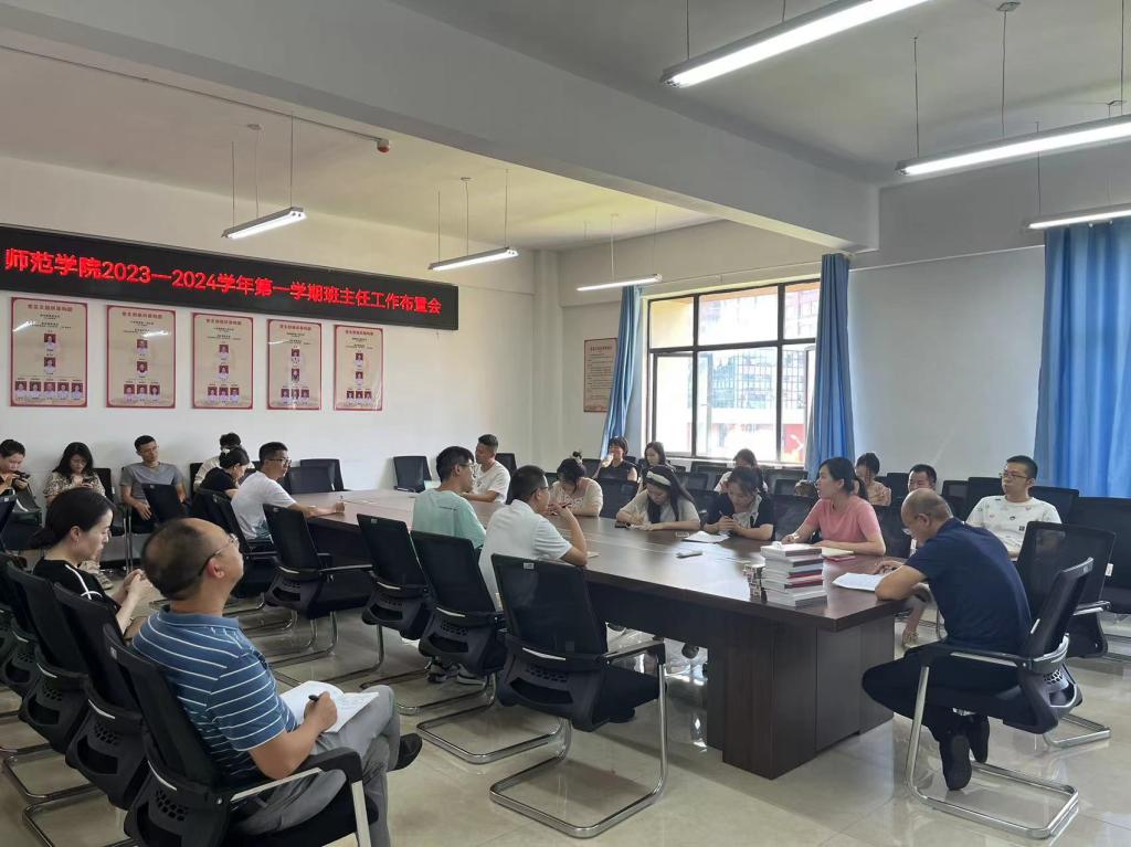 本站讯(师范学院 李静)为确保新学期各项工作有序展开,推进学院稳步发展,9月1日下午,师范学院在正心楼党员活动室召开新学期班主任布置会。会议由院长肖勇主持,学院全体行政人员及班主任参加会议。