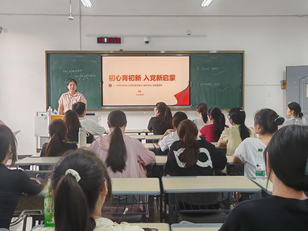 本站讯(师范学院学生工作党支部 杨星)9月18日下午,师范学院在正心楼B204举行以“初心育初新 入党新启蒙”为主题的2024级新生入党启蒙教育。活动由学院学生工作党支部书记杨星主讲,全体2024级新生班级团支书参加。