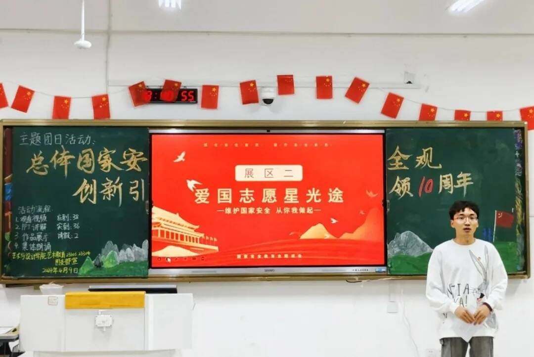 本站讯(团委 甘露 杨雨 学生记者 邓文燕 南灿)国家安全重如山,重任在肩不畏难。为引导广大青年学子增强国家安全意识,厚植爱国情怀,时刻将国家安全牢记心间,4月9日晚,校团委在全校范围内组织开展“总体国家安全观·创新引领10周年”主题团日活动。活动中,各班团支部紧扣主题,采用PPT讲解、观看视频、案例分享、歌曲朗诵、知识问答等多样形式开展此次活动。此次示范性主题团日活动由艺术与设计学院艺术教育23303、23304班团支部承担,校党委委员、组织部部长韩海荣、艺术与设计学院部分领导老师、校团委工作人员、各二级学院团总支书记前往现场观摩,此次活动也在“宜春职院青年”视频号上同步直播,供全校师生观摩学习。活动伊始,通过观看国家安全视频切入主题,引发同学们对国家安全的思考。接着,围绕国家安全观这一主题通过四个展区的表现形式进行宣讲。展区一《国家知识探秘行》主持人带领同学们学习国家总体安全知识,并以知识问答的方式进行巩固,让国家总体安全知识深入同学们的心中;展区二《爱国志愿星光途》通过观看艺术与设计学院国家安全教育漫画作品展和创文明城市志愿者的志愿服务,引导同学们居安思危,警钟长鸣;展区三《创意爱国心声扬》由画展一等奖获得者讲解画作,呼吁同学们要重视生态、军事、消防、国土、网络安全;展区四《热血护国奏华章》引用女兵事迹,在世界屋脊上树立肩膀,以吾辈之青春,捍盛世之中华,随着最后一个音符的悠扬回荡,活动在娓娓动听的朗诵中落下了帷幕,留下了一片热血而坚定的独特回忆。活动结束后,此次示范性主题团日活动点评嘉宾经济管理学院团总支书记彭焕有,对活动所呈现的效果形式与氛围表示充分的肯定,同时也呼吁同学们加强树立国防安全意识,重视知识的传播和思想的碰撞,增强凝聚力和向心力;校党委委员、组织部部长韩海荣表示:此次活动结合主题和专业特点展开了创作,展现出了青年人要有家国情怀,有大我,有国家传统,安全观念,要将国家安全内涵延伸到多方面,并且一代代传承下去,引导好、教育好。此外,各二级学院团支部也通过诗歌朗诵、情景剧演绎、案例分享、大合唱等形式表达自己对此次活动的理解和感悟。师范学院同学们整齐划一的朗诵《国家安全,人人有责》,声音铿锵有力,每一个字都充满了对国家安全的坚定承诺和无限忠诚,展现出了她们为呼吁维护国家安全你应我共守的原则;国际教育学院通过开展《总体国家安全观》知识竞赛,为同学们提供了一个既充满教育意义又极具趣味性的学习平台,在这场别开生面的竞赛中,同学们不仅积极参与,更是展现出了他们对国家安全知识的深刻理解,也在轻松愉快的氛围中收获了宝贵的知识财富;艺术与设计学院将科普国家安全知识与艺术相结合,巧妙地将PPT讲解与书法专业技能相融合,不仅丰富了传统的书法教学内容,还为国家安全知识的普及注入了新的活力;信息工程学院与经济管理学院,采取了多元化的科普方式,通过朗诵、答题、互动和小组讨论等丰富多彩的活动形式,全面而深入地引导同学们树立防患于未然的意识;护理学院与医学院通过观看国家安全主题视频、举行主题朗诵活动以及聆听国家安全之歌等方式感悟安全教育的重要性,坚定他们作为未来医疗工作者应有的责任感和使命感,为他们将来更好地服务社会打下了坚实的基础;机电与新能源汽车学院通过合唱和朗诵诗词等文化活动,引领同学们深入学习“国家安全”这一重要主题,不仅提升了同学们自身的文化素养,也加深了对国家安全重要性的理解,为他们成为国家的栋梁之才奠定了坚实的基础。此外,各班级团支部也通过诗歌朗诵、情景剧演绎、案例分享、大合唱等形式开展此次团日活动。艺术与设计学院艺术教育23303、23304班团支部作为本次示范性主题团日活动承办班级荣获第一名;师范学院学前教育23217班团支部荣获此次活动第二名;国际教育学院应用英语23301班荣获此次活动第三名。