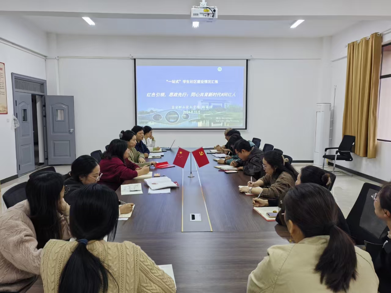 党建与业务深融,思想与工作互促。随后,谢海英传达2024年江西省高校“一站式”学生社区建设现场推进会的会议精神,与大家分享南昌大学、江西师范大学、吉安职业技术学院等高校的“一站式”学生社区建设的模式及先进做法。