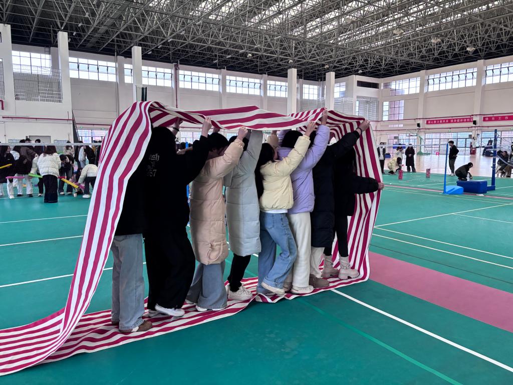 体育馆内,一系列精心设计的心理素质拓展活动逐一展开。同学们个个精神饱满,全情投入。在“投壶”活动中,大家凝神聚力,将箭矢精准地投入壶中,每一次成功命中都引发现场观众的热烈欢呼;“珠行万里”的团队协作中,同学们默契配合,小心翼翼地传递着珠子,紧张与欢笑交织;“公鸡下蛋”的趣味环节,大家蹦蹦跳跳,努力将球从绑在腰后的盒子中抖出,滑稽的动作让人忍俊不禁;“摸石过河”的挑战中,参与者们手脚并用,灵活地踩着“石头”前进,展现了智慧与平衡的完美结合;“同心鼓”的团队合作更是将气氛推向高潮,大家齐心协力,用鼓面弹起球来,每一次成功都伴随着热烈的掌声;“袋鼠跳”的比赛中,同学们套上布袋,奋力跳跃,欢快的节奏和加油声此起彼伏,让整个场地沸腾起来。