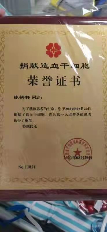 为了帮助有需要的人,挽救更多人的生命,在2020年一次无偿献血时,陈祺轩主动加入了宜春市红十字会造血干细胞志愿者队伍。