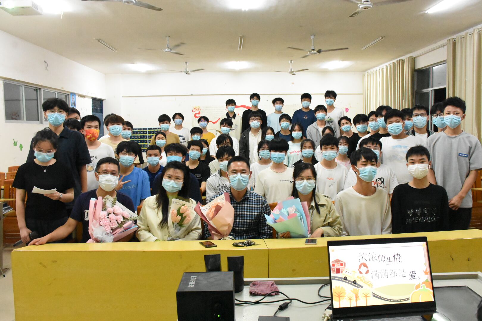 活动伊始,主持人带领大家一起观看老师们的校园防疫工作视频,视频中老师校园忙碌的身影,办公桌前堆积如山的文件要审核等等画面,让在场的师生感受到了老师工作的不易。接着,学生代表发言,感谢老师的同时表示只要老师需要,愿意为老师分忧。随后,四位老师与学生一起做互动猜字游戏,来促进师生感情。最后,全班齐唱《老师你好》并给四位老师献花,整场活动掌声不断、氛围活跃。结束活动后,李兵兵肯定了此次活动从环节到细节紧扣主题,作为老师得到同学们的理解很感动,最后鼓励同学们珍惜在校时光,成长为更好的自己。