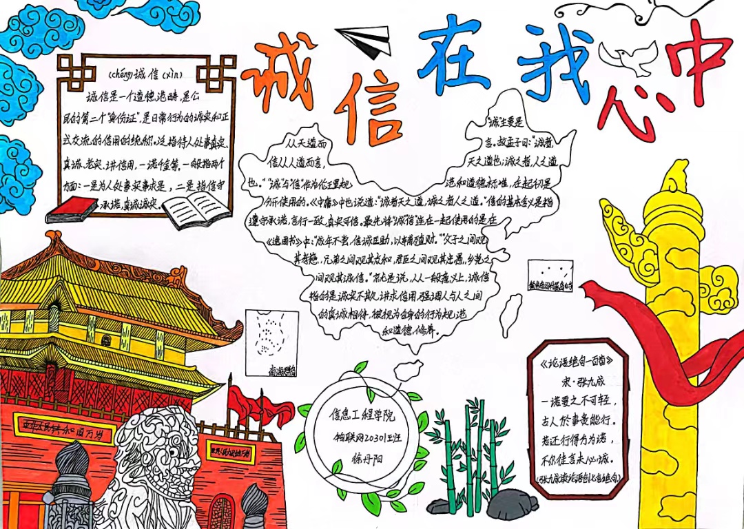 本站讯(信息工程学院 李纪杨)为落实创新资助育人形式,引导全院学生树立诚信理念,营造学院诚信氛围。信息工程学院于2022年5月开展了以“诚信在我心中”为主题的手抄报征集活动。