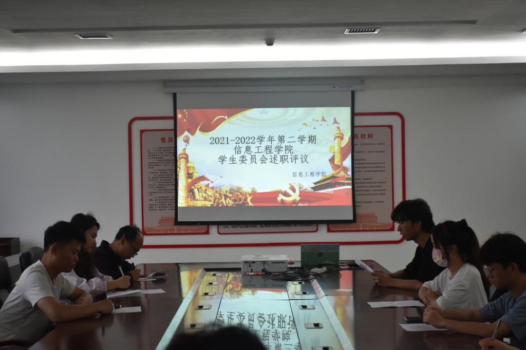 本站讯(信息工程学院 刘嘉妮 学生记者 杨子安) 为持续推动我院学生会工作改革,落实学生会述职评议制度,信息工程学院于6月5日举行了2021-2022学年第二学期学生委员会述职评议会,院党总支副书记简靖韡、学生会指导老师刘嘉妮、辅导员黄彪、院学生会成员及各班学生代表参加出席本次会议。