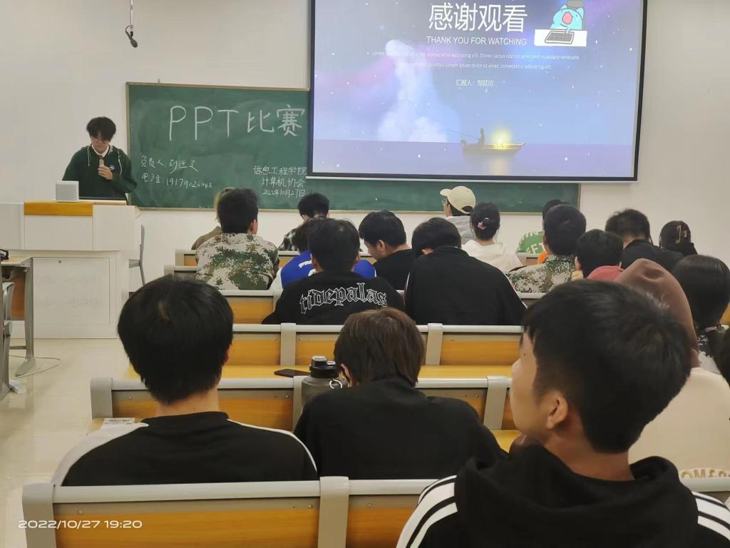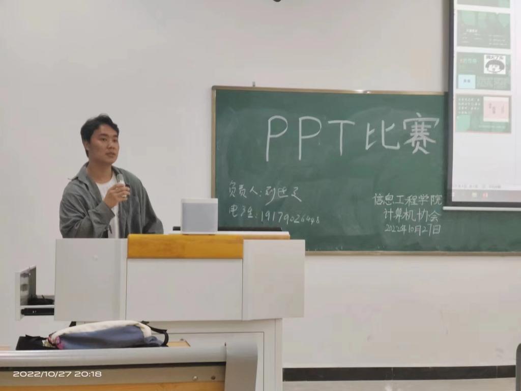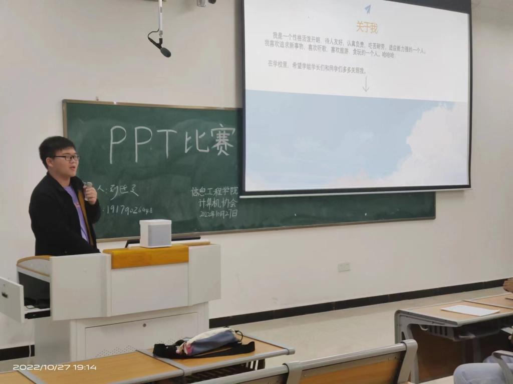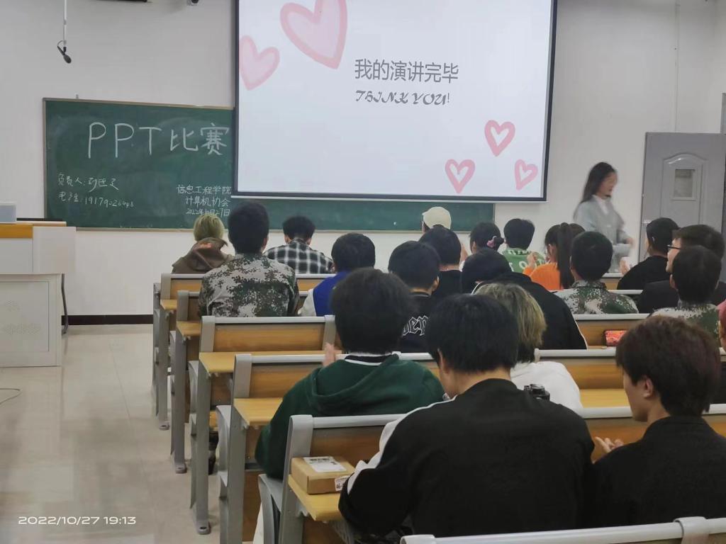 本站讯(信息工程学院 学生记者 张宇)为了丰富协会成员的课余生活,加强新成员对专业知识的了解,同时考察新成员办公软件的熟练度。2022年10月27日,计算机协会于正心楼D518召开了PPT演讲比赛。