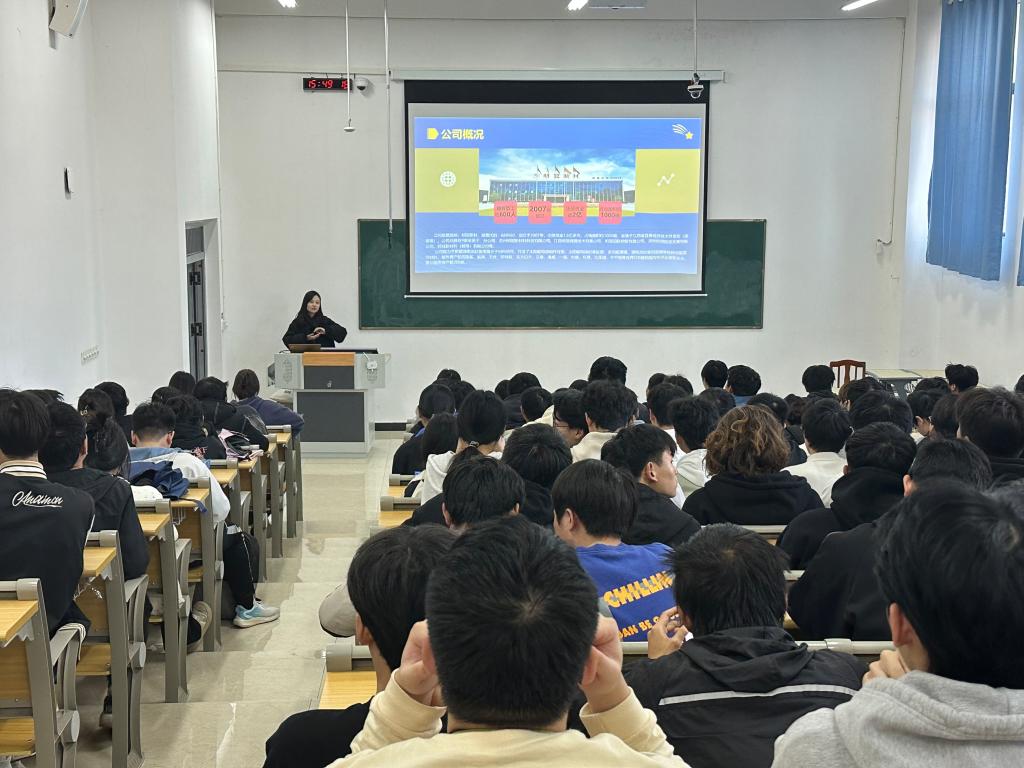 公司校招负责人栗经理向学生们详细介绍公司概况、企业文化、招聘岗位、薪资待遇、员工培养模式以及行业发展前景。学生认真倾听,并积极与校招负责人进行交流互动,现场气氛活跃。