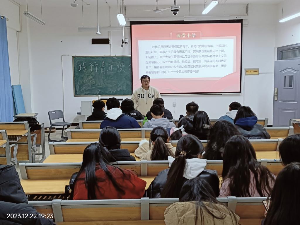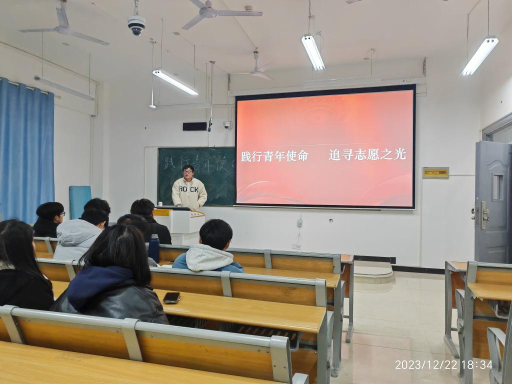 本站讯(信息工程学院 黄彪 学生记者 胡海涛)为激励引导广大青年学子勇于担当,积极奋斗,12月22日晚,信息工程学院青年志愿者协会在和济楼C304开展以“践行青年使命,追寻志愿之光”主题授课。马克思主义学院老师张保揭担任主讲,全体协会成员参加。