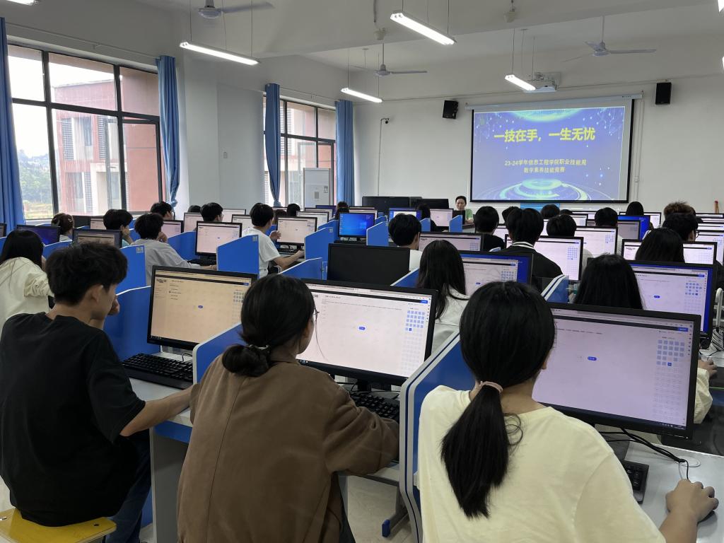 本站讯(信息工程学院 谢小欣)为积极贯彻落实职业教育活动周精神,提升学生的数字素养技能,5月23日,信息工程学院在智云楼B403和B405实训室成功举办一场别开生面的学生数字素养技能竞赛。本次赛事全院百余名学生踊跃参与,场面紧张热烈。