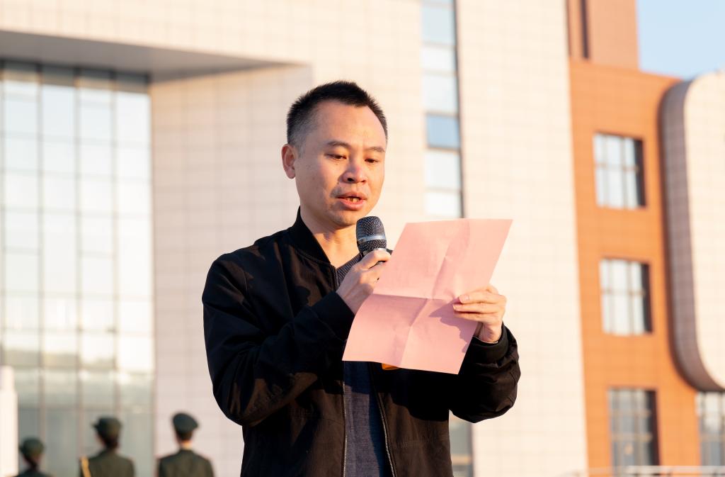 伴着雄壮的国歌声,国旗护卫队迈着铿锵有力的步伐护送国旗入场,全体师生面向国旗行注目礼,共唱国歌,庄重肃穆。礼毕,罗来曦在国旗下发表讲话,他肯定了学院师生今年在教育教学与技能竞赛中取得的丰硕成果,鼓励师生要以更加饱满的热情和坚定的信念,迎接未来的挑战,时刻铭记自己的使命与责任,做到努力学习专业知识,不断提升实践能力,为学院和学校的发展贡献力量。