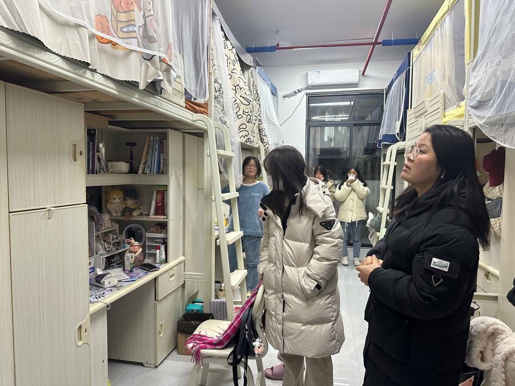 黄慧精进入学生宿舍查看了多个宿舍的用电情况,叮嘱学生:严禁使用违规电器,严禁将插座带上床,不要一个插座多个设备同时用电,人走及时关闭电源等等。考虑到天气渐冷,部分同学可能会使用热水袋等电器进行取暖,黄慧精也向同学们普及了使用大功率电器的安全隐患。同时,她还关心同学们的生活情况和学习情况,表示有任何问题都可以找老师寻求帮助,老师都会热情地帮助同学们解决问题。