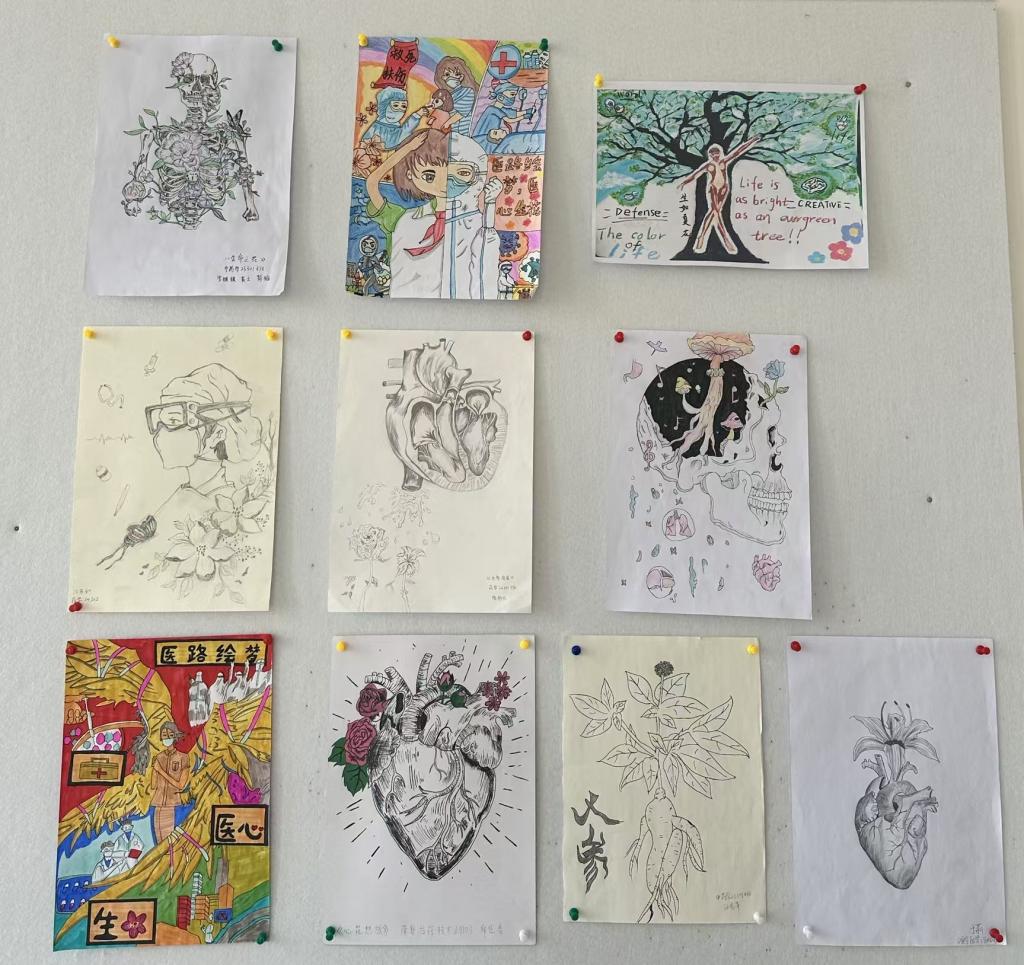 同学们凭借扎实的医学知识和丰富的创造力,用画笔描绘出对生命的感悟。有的作品聚焦人体器官的精妙结构,展现生命的构造之美;有的则以医患互动为场景,诠释生命的温暖与力量;还有的通过对药物、药品等元素进行创意呈现,探索生命的奥秘。