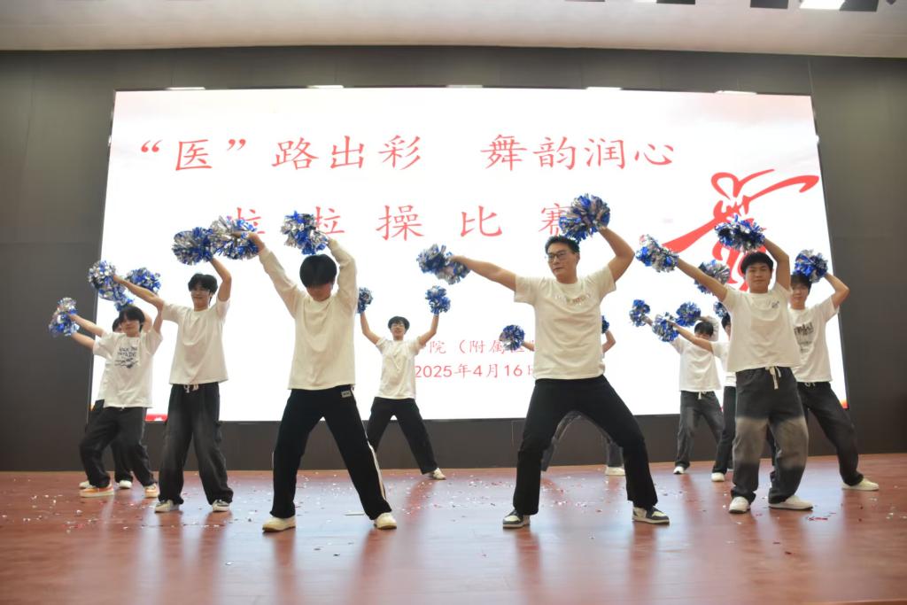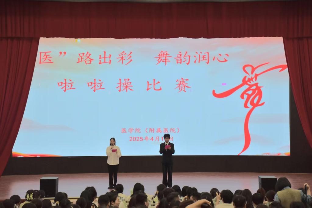 为全面贯彻落实教育部、省教育厅关于大学生心理健康教育工作的相关要求,积极响应学校心理健康教育活动月系列活动,丰富校园文化生活,促进学生心理健康发展,4月16日,医学院(附属医院)在仁济楼小礼堂举行 “‘医’路出彩·舞韵润心” 啦啦操比赛。院党总支副书记李莫娴,副院长袁经永、周围,学工负责人李灿,辅导员刘清珍、刘倩出席。2024级近400名师生代表齐聚一堂,共同为参赛队伍加油助威。