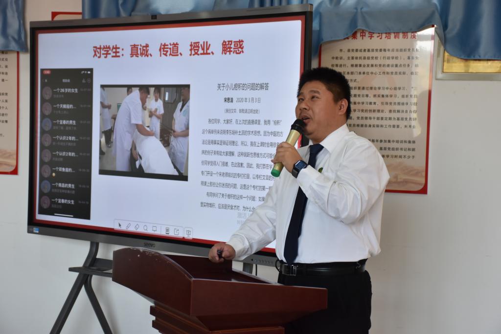 宋思清以“修身与教学,我的教师成长之路”为主题,从“对学生:真诚、传道、授业、解惑”“对学校:责任、奉献、共同成长”“对社会:关注痛点、服务社会”“对自己:善于学习,勇于创新”四个方面展开,分享了自己从一名先天性弱视患者成长为骨干教师的历程。他勉励年轻教师修炼好基本功,提升专业素养,让理论有魅力,让教学有艺术,让学生有收获。
